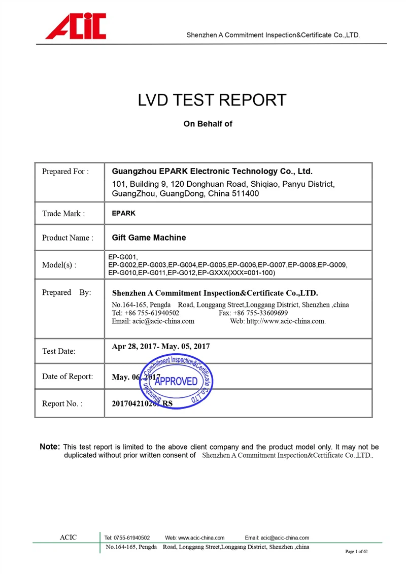 Txhua EPARK arcade tshuab ua raws li kev nyab xeeb thoob ntiaj teb thiab cov ntawv pov thawj zoo. Kev soj ntsuam nruj kom ntseeg tau tias kev ua haujlwm ruaj khov, ua haujlwm ntev, thiab kev ua haujlwm nyab xeeb hauv kev lag luam ib puag ncig.